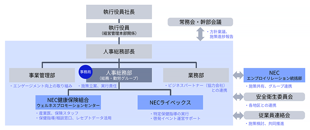 最高責任者を社長が担当し、人事総務部を中心に関連する安全衛生委員会、従業員連絡会や社内外の各部門と情報共有を行いながら、職場環境の安全・衛生面に関する問題提議や対策の推進、健康経営施策の展開を行っています。