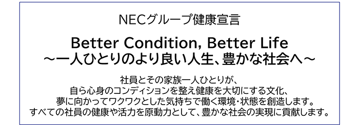 NECグループでは2019年度に「NECグループ健康宣言」を制定しました。健康宣言には、単に病気にならなければよいということではなく、よりよいコンディション(健康状態)を目指して行動し、一人ひとりが心身ともにいきいきと働くことで自己実現を果たし、ひいてはNECグループの社会価値創造につなげたいという思いが込められています。